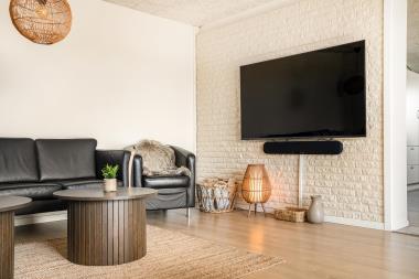 Huset er pænt møbleret med 3×3 personers sofaer, hvor der er mulighed for at slappe af og se fjernsyn/DVD eller blot lytte til sin yndlingsmusik.