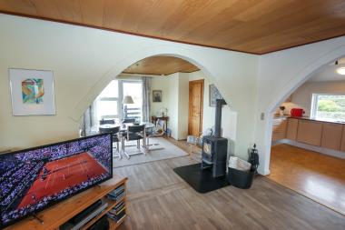 Stue: Brændeovn, F-TV med DR kanaler og TV2, stereoanlæg.