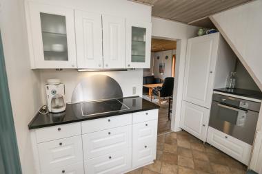 Køkkenet er forholdsvis nyt fra 2008 og har opvaskemaskine, glaskeramisk kogeplader og komfur og køle-fryseskab. Herfra der der adgang til stuen som byder på brændeovn, spisebord samt sofagruppe med sofabord. Herudover er der også et TV med tyske kanaler samt stereoanlæg med CD. Der hører Chromecast til tv’et. Huset råder over 2 soveværelser hvoraf det ene soveværelse er med dobbeltseng og det andet værelse er med 1 køjeseng og en sovesofa til en person.