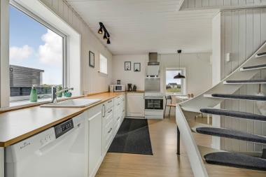 Køkkenet er helt nyt og der er bla opvaskemaskine,køle/fryse skab og mikroovn. I køkkenet findes der spiseplads til 2 personer. Dejligt badeværelse med gulvvarme og brus, badeværelset er med klinker på gulvet. Gæstetoilettet er med klinker, håndvask og gulvvarme. Sommerhuset har også en dejlig sauna. Lofter og vægge er beklædt med træ, ligeledes er gulvet af træ. Sommerhuset har to stuer og den ene er i underetagen hvor der er spisebord til 6 personer samt aktiviteter såsom bordfodbold og billardbord. Den anden stue er ovenpå og her er masser af hygge med fritlagte bjælker og med udsigt til klitterne. Her findes fladskærm med dr 1 samt DVD-afspiller og der er sofa arrangement samt brændeovn. Huset har 3 soveværelser: 1DS + 2S + 1DS. Fra soveværelset ovenpå kan man nyde udsigten udover markene. Der er vaskemaskine i baggangen. Der er installeret varmepumpe i huset og det betyder at du som gæst kan spare en del på din elvarmeregning – varmepumpen leverer op til 4 gange så meget effekt som den bruger, det betyder at for hver kilowatt-time pumpen bruger yder den varme svarende til ca. 4 kW energien udnyttes dermed langt. Udenfor er der anlagt et wellnessrum med et stort spa indeni, så man er i ly for vejret.