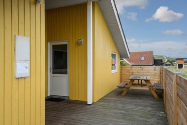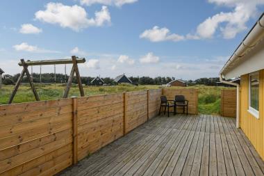 Udenfor finder I en dejlig terrasse med havemøbler, solvogne og grill, hvor I kan nyde solen, grille aftensmad eller drikke en kop kaffe, mens I mærker den friske havluft. Til børnene er der gynger og sandkasse, hvor de kan lege frit og trygt.