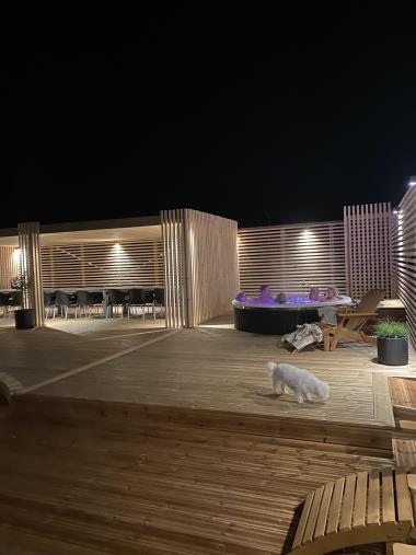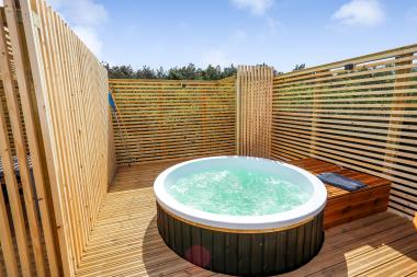 Centralt beliggende på en 100% indhegnet, velholdt grund tæt ved indkøb og spisemuligheder og kun 800 m fra Vesterhavet. Udearealerne er også et kapitel for sig. Store, velholdte terrasser med havemøbler. Bag huset er der et helt nyopført terrasseanlæg i træ som skaber en “sydlandsk” stemning. Der er loungesæt, liggestole, pergola med stort havebord og stole, afdeling med udebruser og nedsænket spabad til 4-6 personer, det perfekte sted at nyde udendørs livet. Indhegnet grund med mange gode læ og solmuligheder. Til børnene er der legetårn med gynger. Luk lågen til haven og nyd at både husdyr og børn frit kan tumle på den lukkede grund. Det perfekte hus i høj kvalitet og med masser plads. Kan beboes af op til 24 personer.